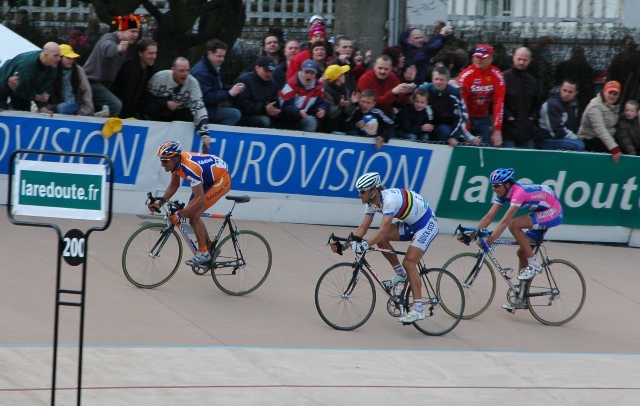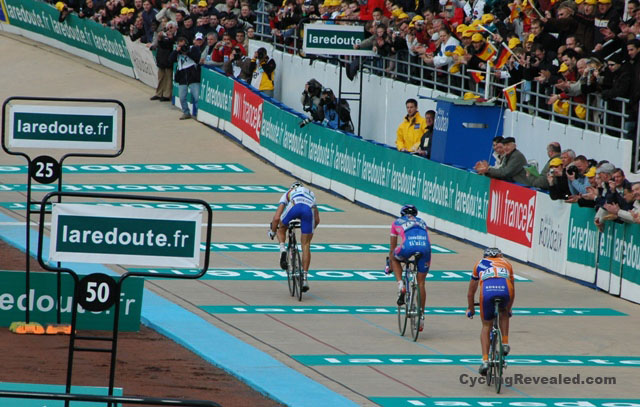 Paris-Roubaix: Tom Boonen, Alessandro Ballan, and Juan Flecha complete the lap and a half of the Velodrome.