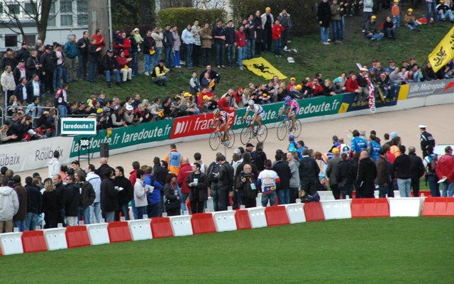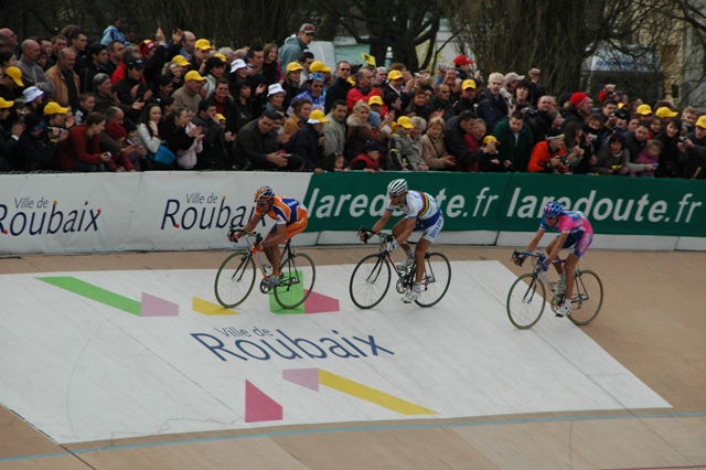 Paris-Roubaix: Tom Boonen, Alessandro Ballan, and Juan Flecha complete the lap and a half of the Velodrome.
