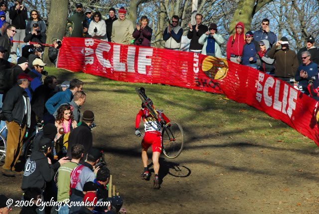 Huge crowd cheers the leader up the Cliff Bars run-up