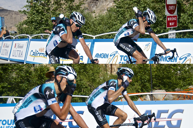 Tour of California 2013: Omega Pharma's synchronized "Bidon work" [ Photo ©: Barry Boyce, CyclingRevealed ]