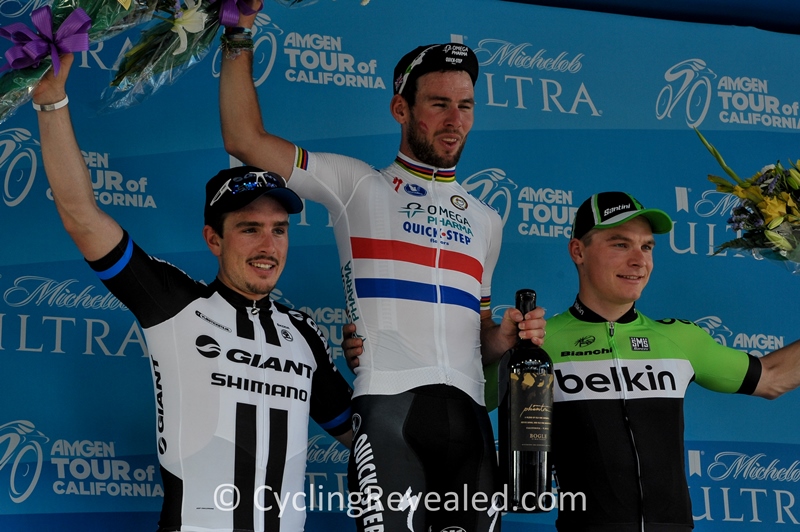 Stage winner Mark Cavendish, (L) 2nd placed John Degenkolb, (R) 3rd placed Moreno Hofland Tour of California 2014 [ Photo ©: Barry Boyce, CyclingRevealed ]